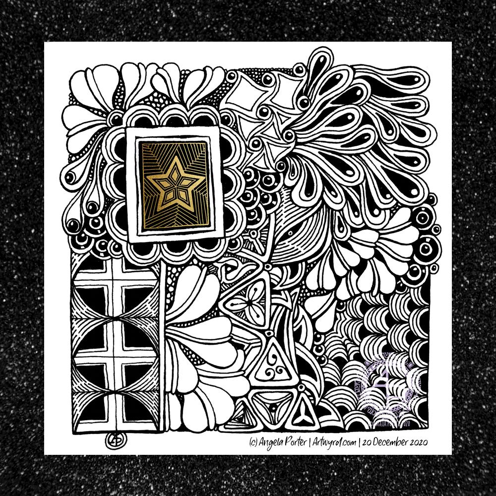 I’d started this drawing yesterday afternoon, after I’d completed the coloured templates for Entangled Starry Skies. I got a fair amount of it done when I woke in the night. I completed it this morning, after I woke around 8:30am, with a threatening migraine-type headache. I’ll be back to bed soon once the headache pills have kicked in; I often feel very tired with this kind of headache.
