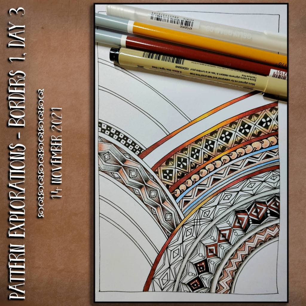 I’ve also made a decision to leave the case-bound A5 sketchbook to keep my pages in an A5 discbound system. I was getting frustrated with pages not lying flat, the awkwardness of turning the book around. The discbound system allows me to use individual sheets of paper, of many different kinds and colours. It’s flexible in it’s organisation too. I’ve flip-flopped ‘twixt traditionally bound sketchbooks and discbound sketchbooks for a while. My experience with this pattern exploration project has made me aware that the ability to work on a single sheet has become so important for many, many reasons.