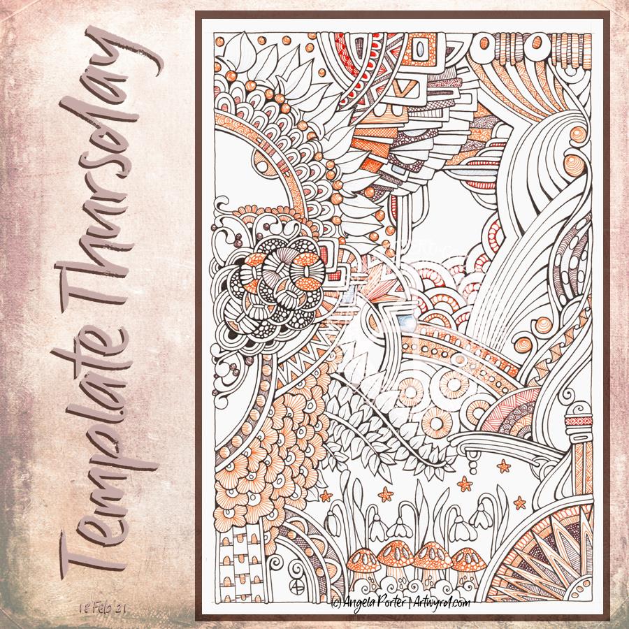 This week’s template is a typically ‘Angela’ entangled style drawing. A stylised dragonfly floats above an entangled background containing arches and seed pods, flowers and foliage, along with various patterns and an intricate border.