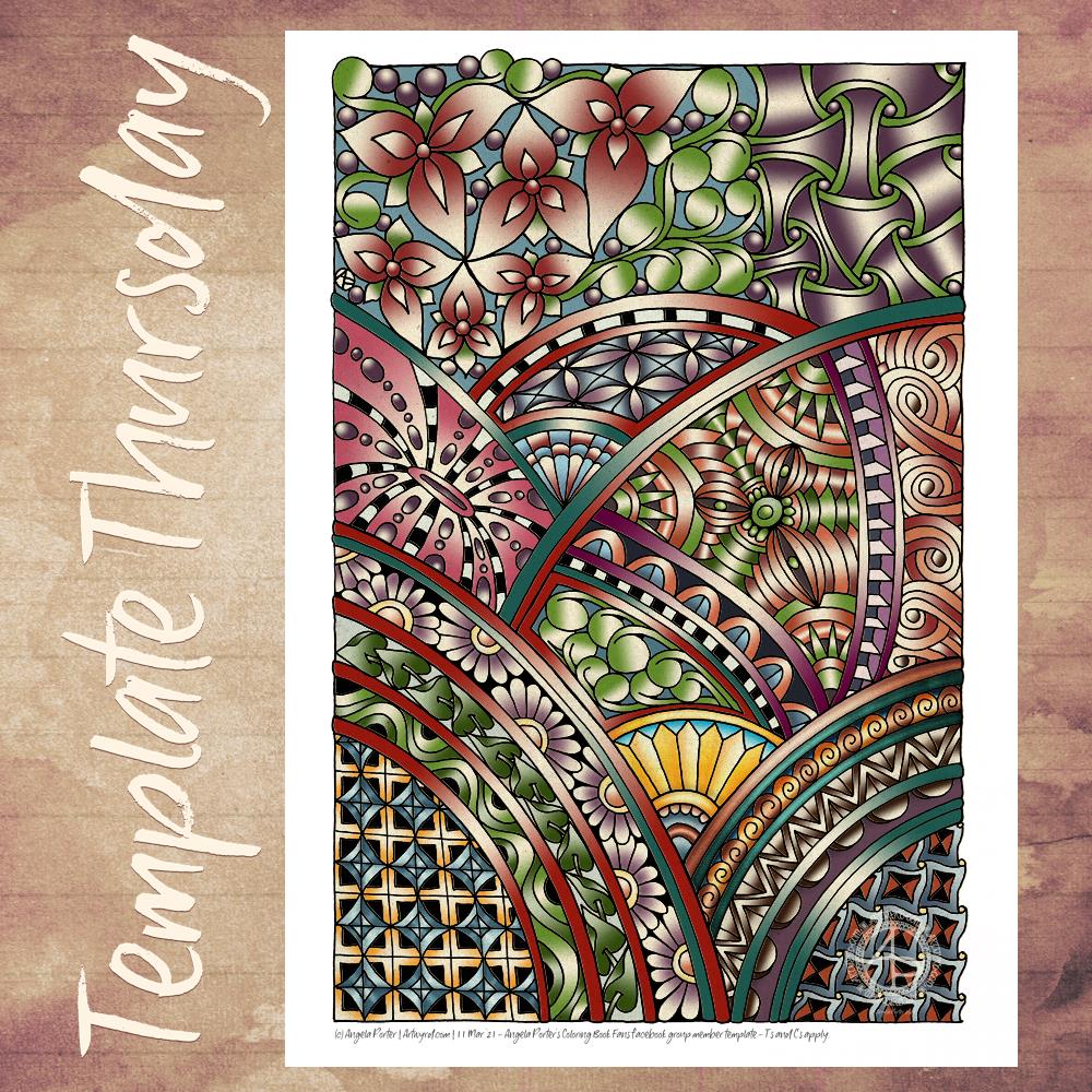 This week, my template for members of the Angela Porter’s Coloring Book Fans facebook group is a typically entangled one – full of Zentangle-style patterns, arches, a few flowers and organic motifs added, but mainly purely abstract. Great fun to add colour to!