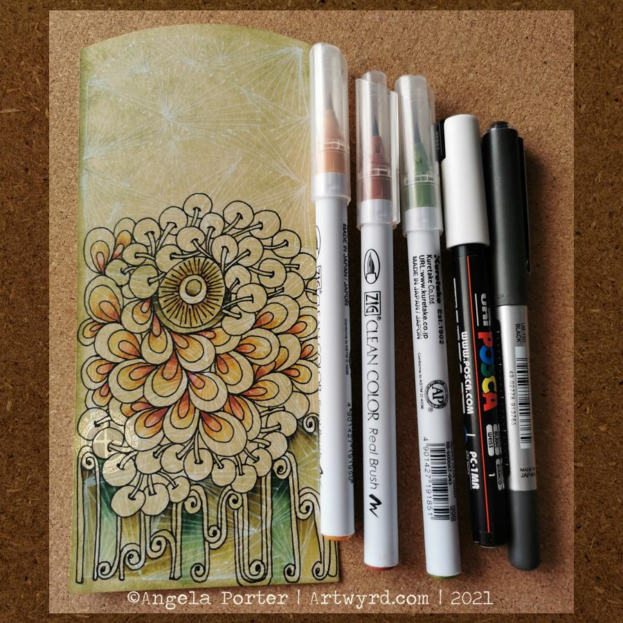 It did. You can see the underlying pattern coming through the more darkly coloured areas. Also, the Zig clean colour real brush pens (what a mouthful of a name!) worked beautifully on the background. I was careful to choose colours that would work sympathetically with the Distress Ink background. Distress Inks are water-reactive so any wet media will reactivate them