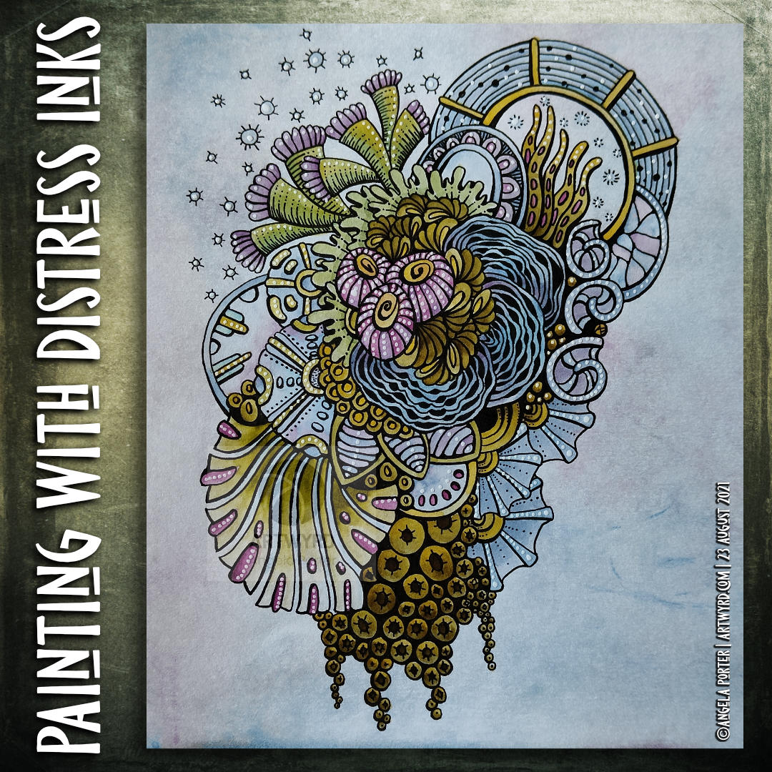 I woke with a stinking headache this morning. So, spending some time adding colour to an entangled drawing, along with a couple of headache pills, was just what was needed. And listening to a podcast or three.